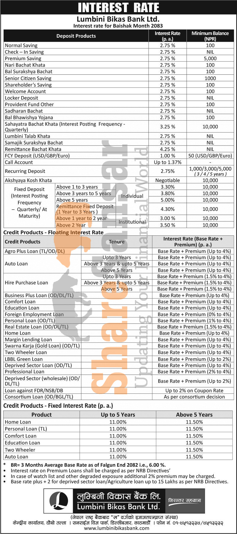 Lumbini Bikas Bank Limited has published a notice regarding the new interest rate for deposit and loan products and it's effective from 1st Baisakh, 2083.
