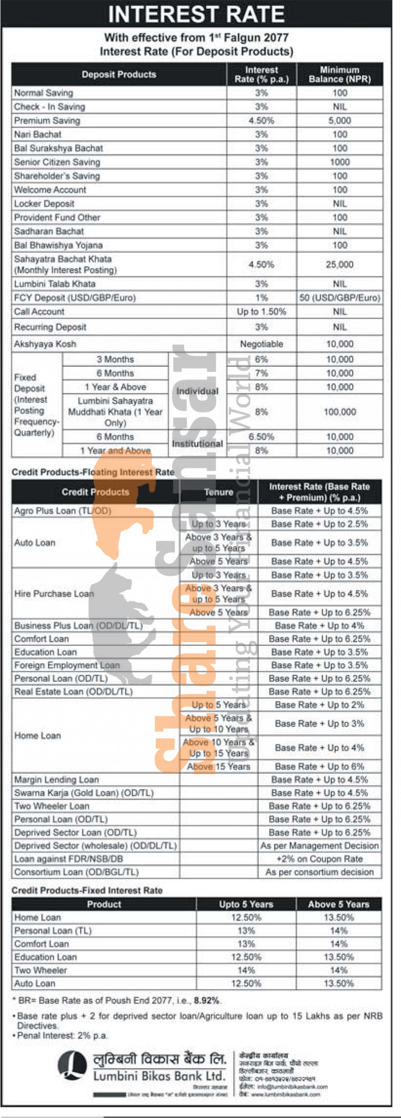 Lumbini Bikas Bank Limited has published a notice regarding the new interest rate for deposit and loan products and it's effective from 1st Falgun, 2077.
