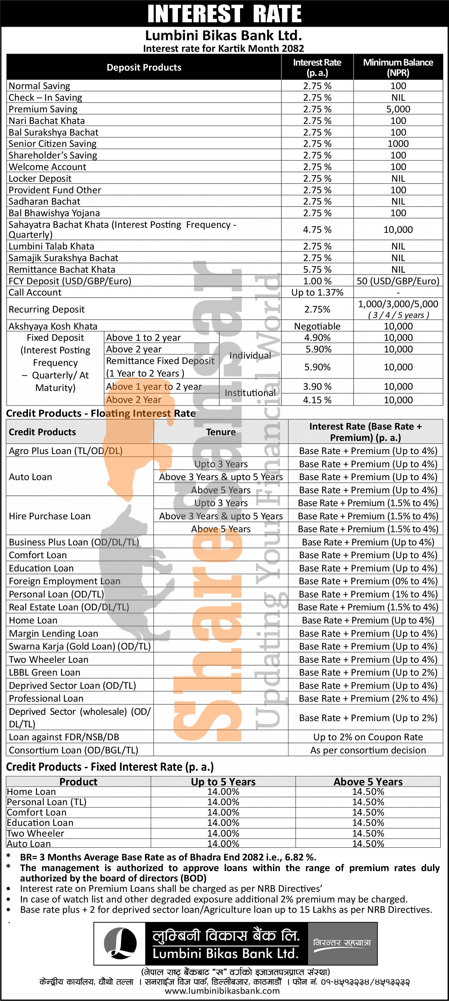 Lumbini Bikas Bank Limited has published a notice regarding the new interest rate for deposit and loan products and it's effective from 1st Kartik, 2082.