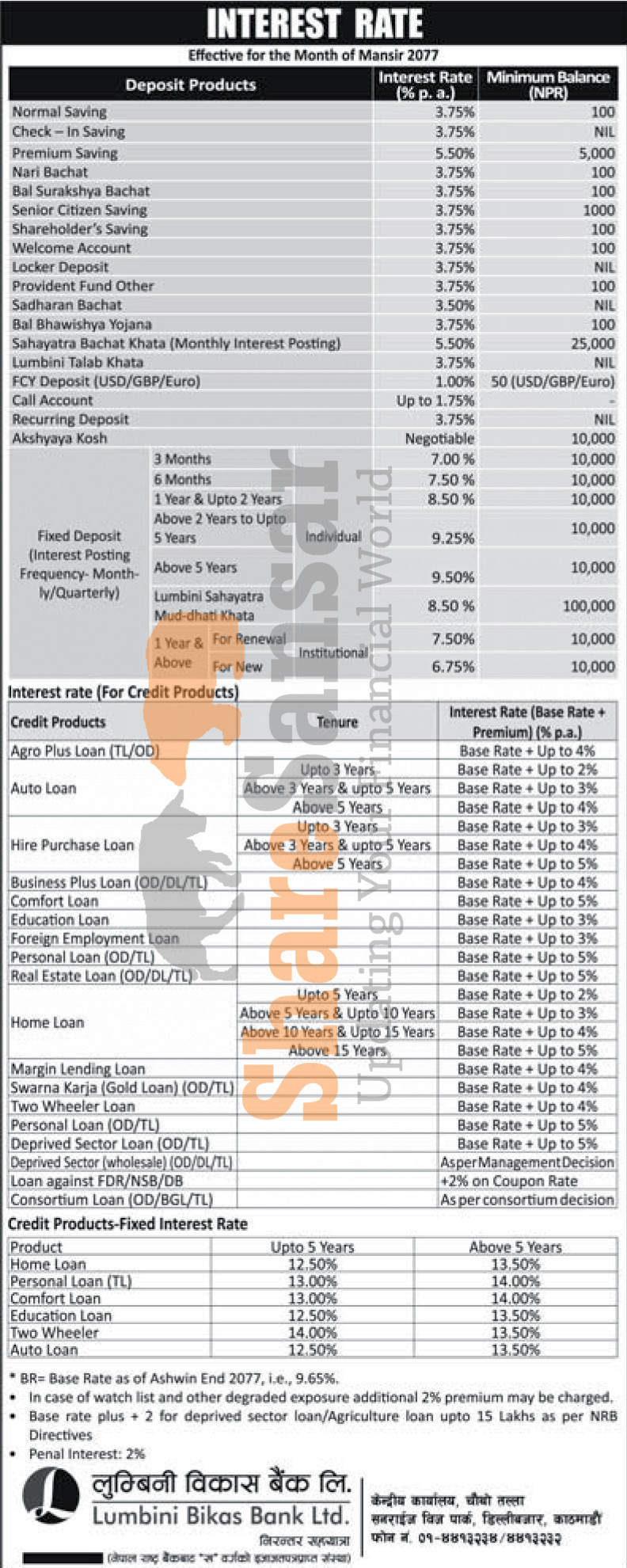 Lumbini Bikas Bank Limited has published a notice regarding the new interest rate for its deposit products and loan and it's effective from 1st Mangsir, 2077.