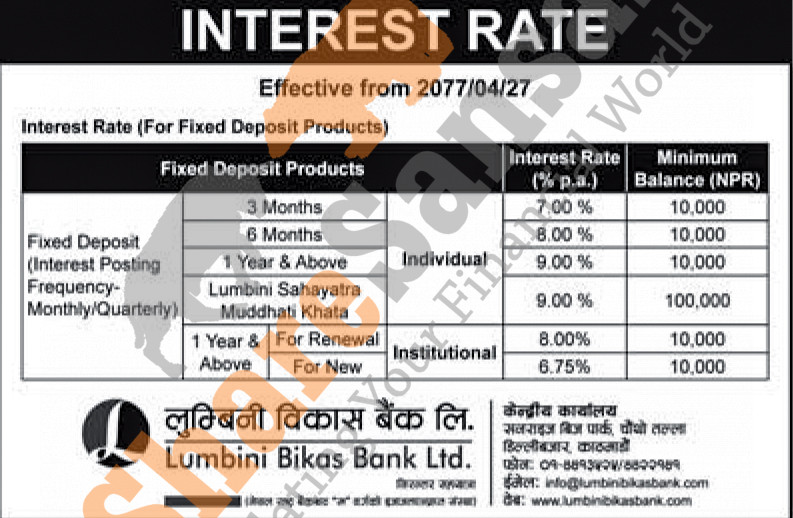 Lumbini Bikas Bank Limited has published a notice regarding the new interest rate for its fixed deposit products and its effective from 27th Shrawan, 2077.