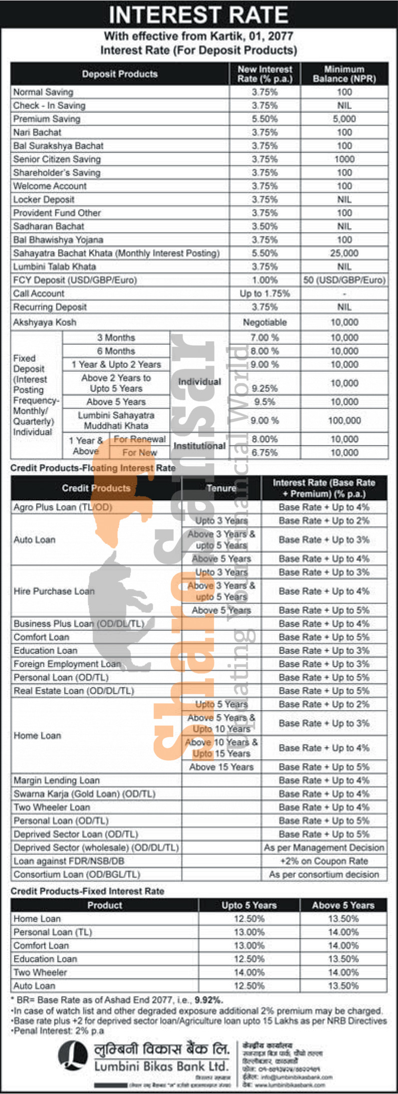 Lumbini Bikas Bank Limited has published a notice regarding the new interest rate for its loan and deposit products and it's effective from 1st Kartik, 2077.