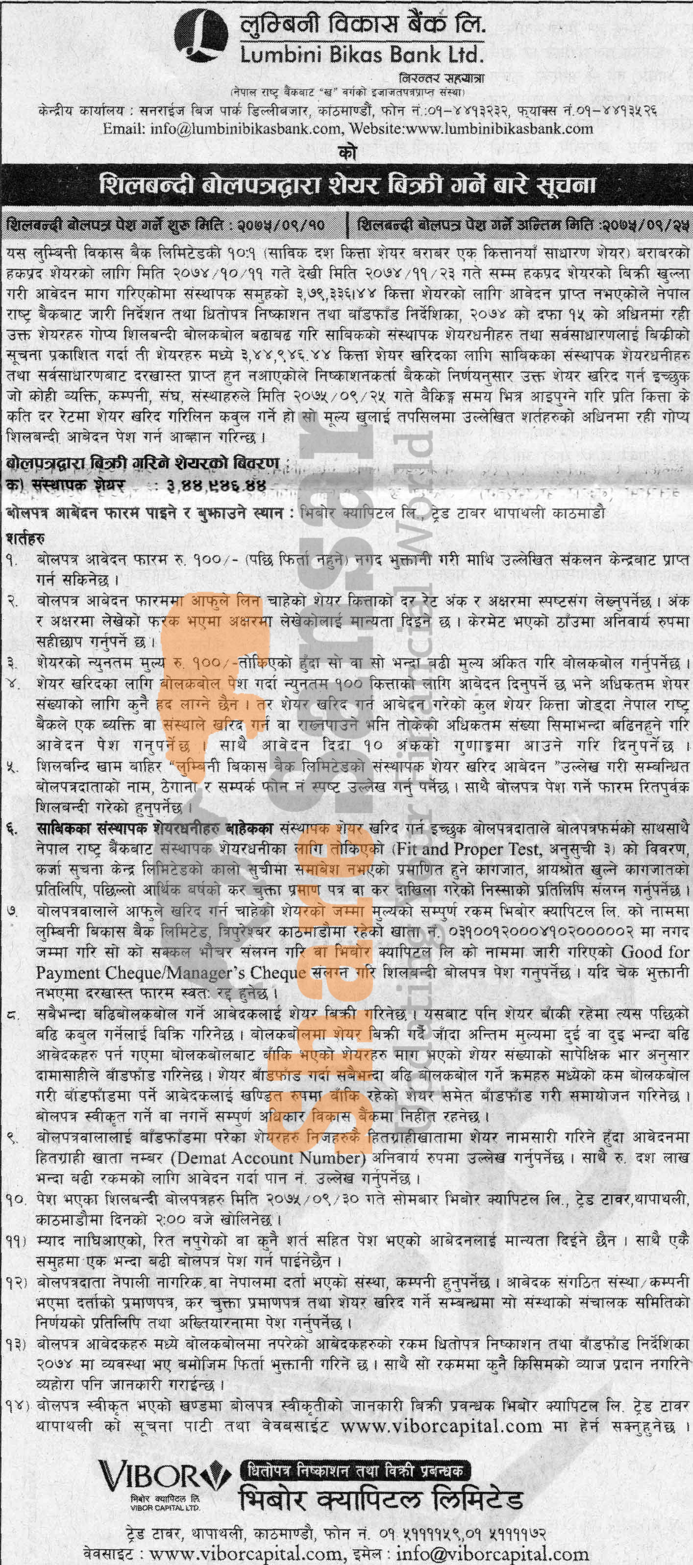 Lumbini Bikas Bank Limited is selling its 3,44,946.44 unit promoter shares in auction to the general public from (10th to 25th Poush, 2075).