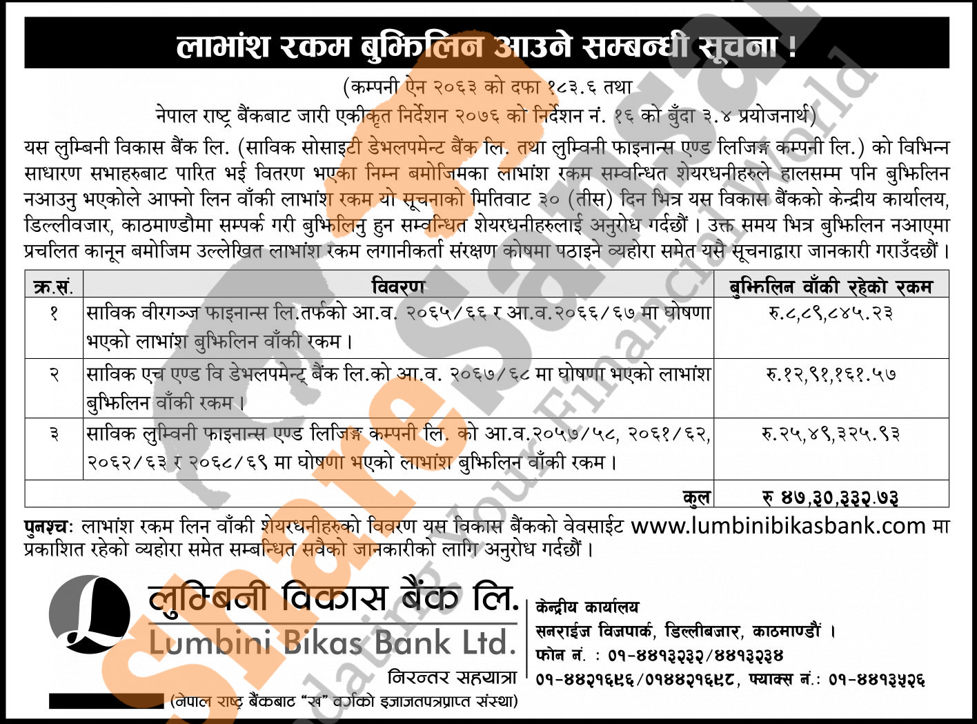 Lumbini Bikas Bank Limited urges its shareholders to collect the uncollected due dividends.