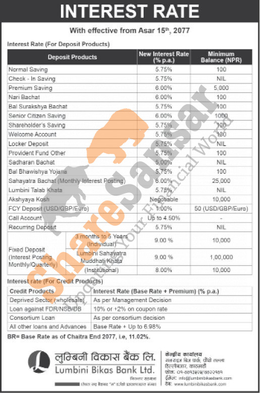 Lumbini Bikash Bank Limited has published a notice regarding new interest rate and its effective from 15th Ashad, 2077.