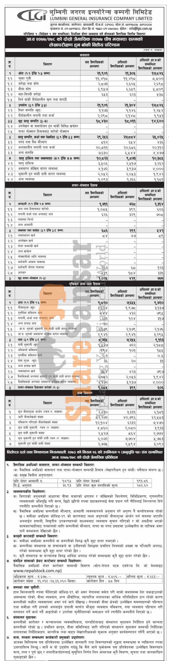Lumbini General Insurance Company Limited has posted a net profit of Rs 102.50 million and published its 2nd quarter company analysis of the fiscal year 2077/78.