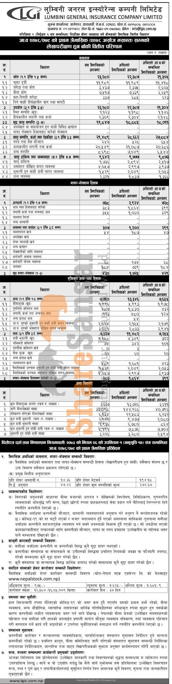 Lumbini General Insurance Company Limited has posted a net profit of Rs 43 million and published its 1st quarter company analysis of the fiscal year 2078/79.