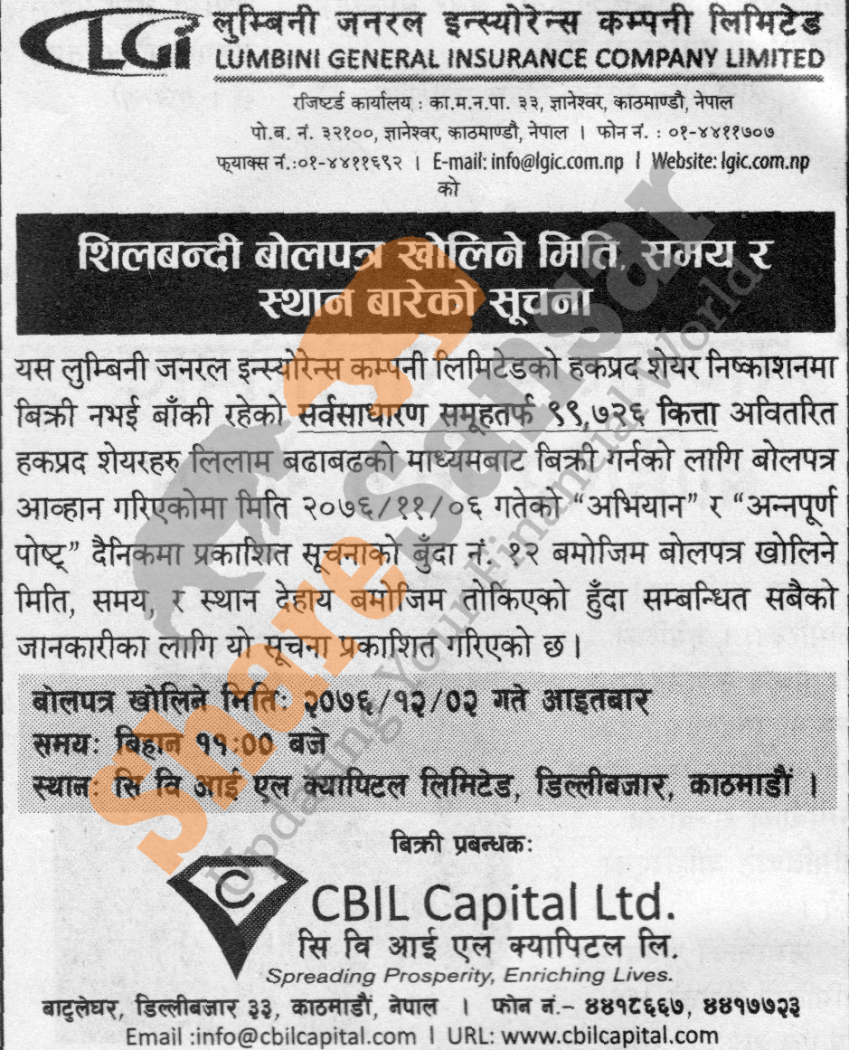 Lumbini General Insurance Limited has published a notice regarding bid opening date of 99,726 units ordinary share in auction to the general public on (2nd Chaitra, 2076).