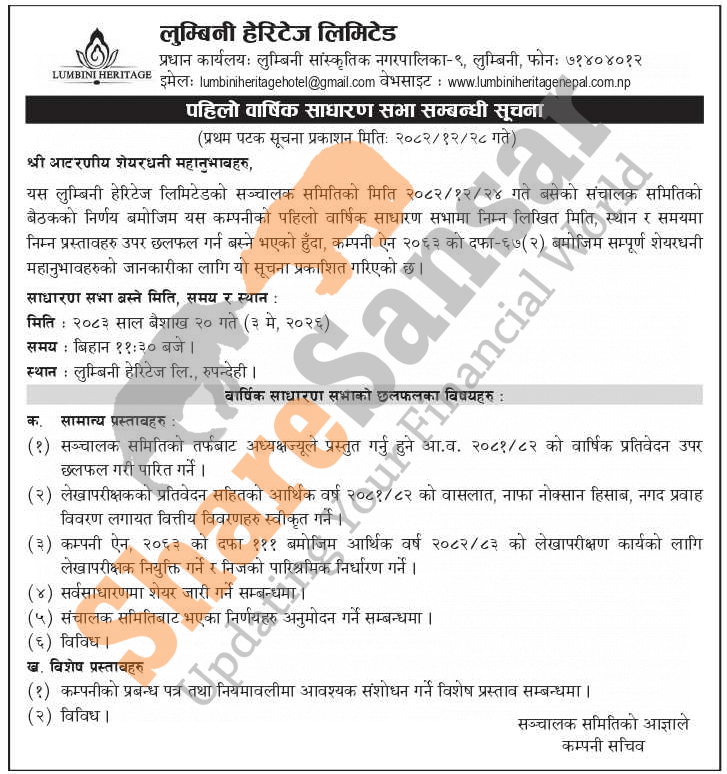 Lumbini Heritage Limited has announced its 1st AGM going to be held on 20th Baisakh, 2083.