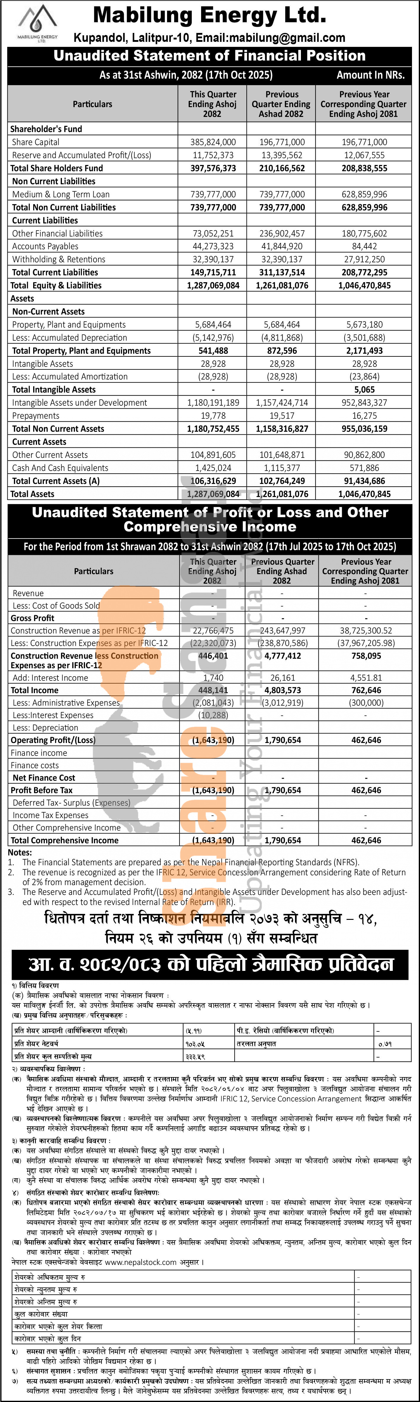 Mabilung Energy Limited has posted a net loss of Rs 1.64 million and published its 1st quarter company analysis of the fiscal year 2082/83.