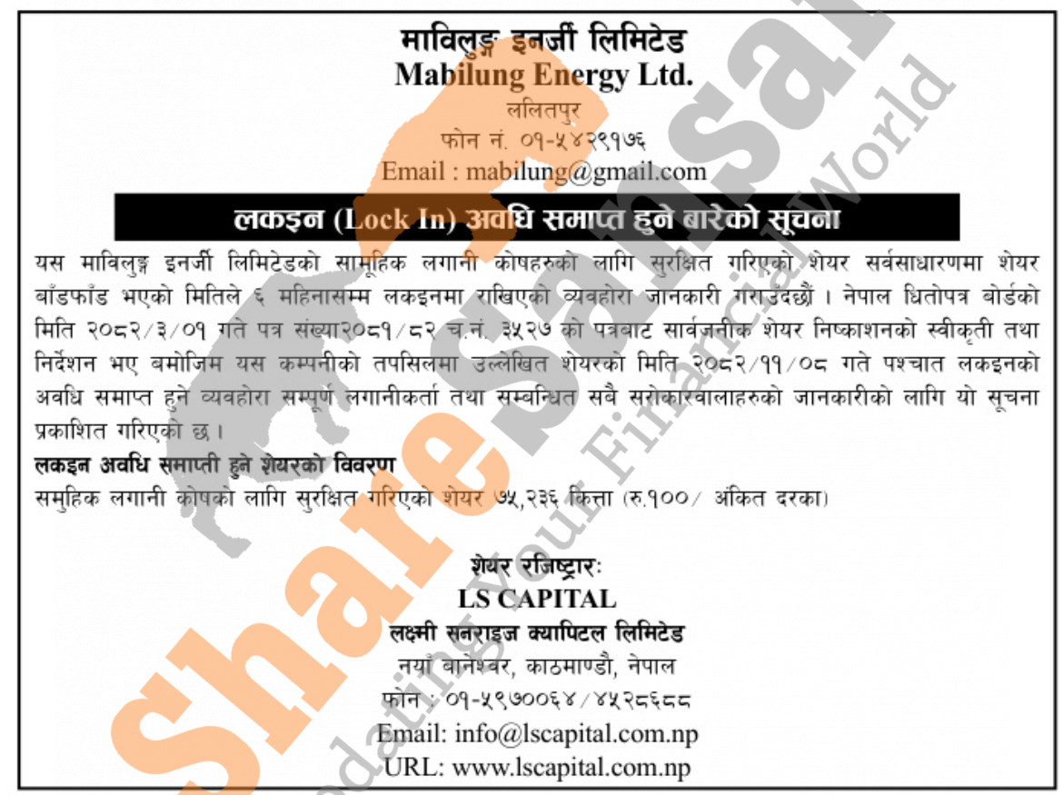 Mabilung Energy Limited has published a notice regarding the expiration of the lock-in period of Mutual Fund for all investors and stakeholders on 8th Falgun, 2082.