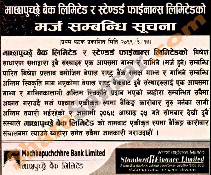 Machhapuchchhre Bank Limited and Standard Finance Limited have jointly published a notice for receiving a final approval for merger from NRB.