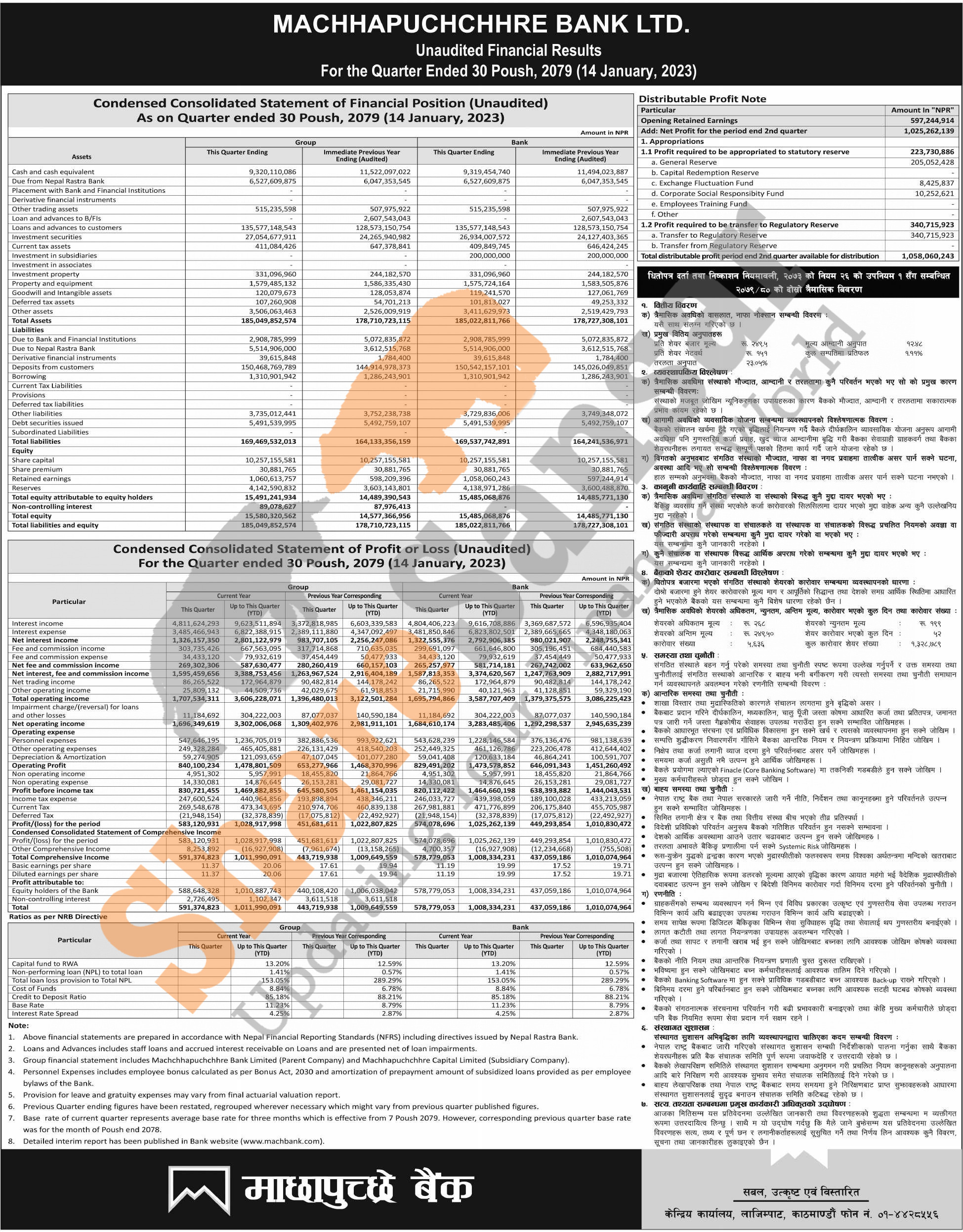Machhapuchchhre Bank Limited has posted a net profit of Rs 1.16 billion and published its 2nd quarter company analysis of the fiscal year 2079/80.