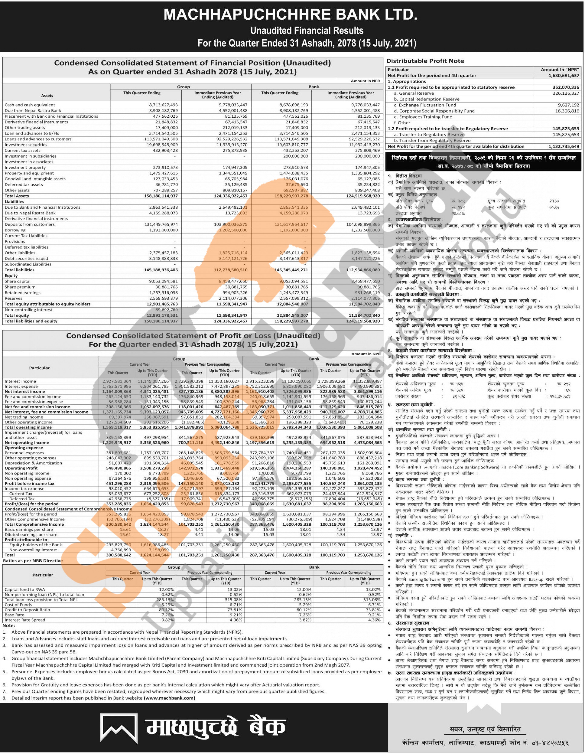 Machhapuchchhre Bank Limited has posted a net profit of Rs 1.63 billion and published its 4th quarter company analysis of the fiscal year 2077/78.