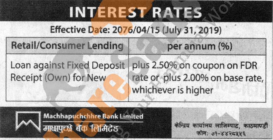 Machhapuchchhre Bank Limited has published a notice regarding new interest rate and its effective from 15th Shrawan, 2076.