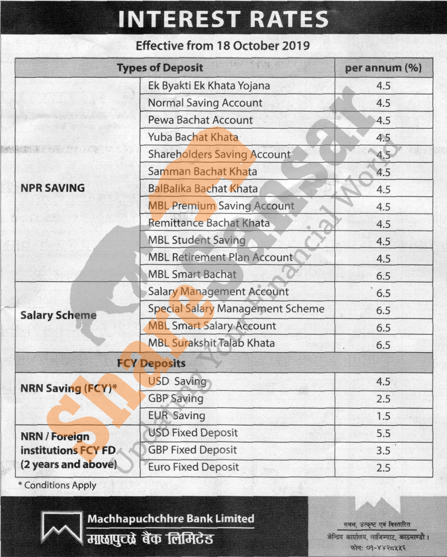 Machhapuchchhre Bank Limited has published a notice regarding new interest rate and its effective from 1st Kartik, 2076.