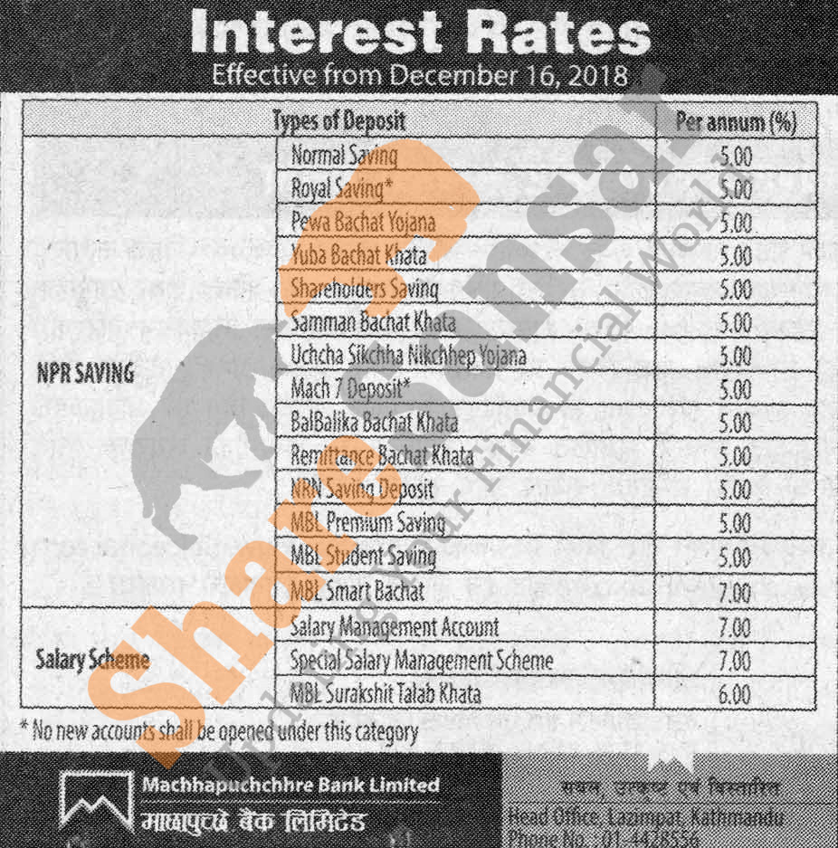 Machhapuchchhre Bank Limited has published a notice regarding new interest rate and its effective from 1st Poush, 2075.