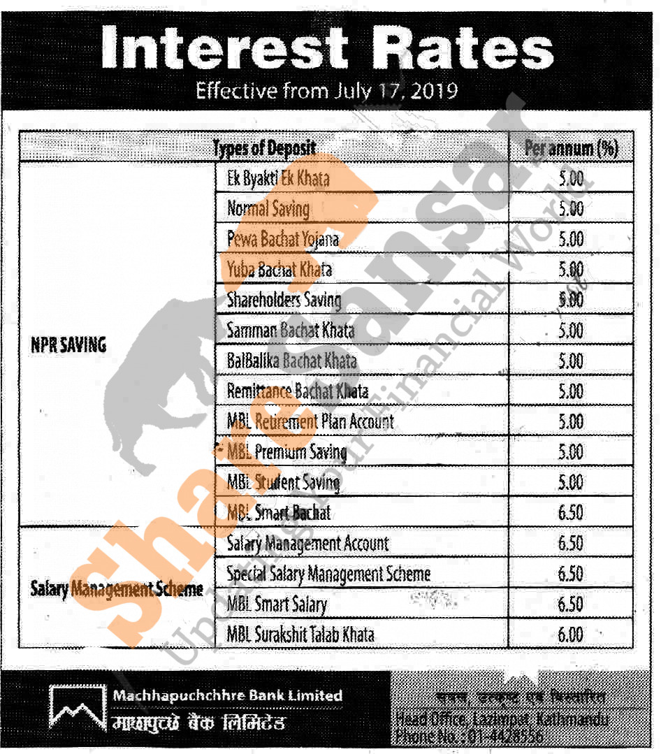 Machhapuchchhre Bank Limited has published a notice regarding new interest rate and its effective from 1st Shrawan, 2076.