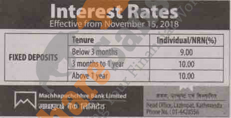 Machhapuchchhre Bank Limited has published a notice regarding new interest rate and its effective from 29th Kartik, 2075.
