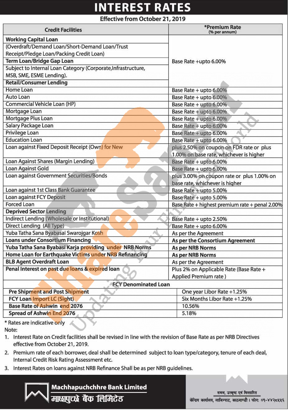 Machhapuchchhre Bank Limited has published a notice regarding new interest rate and its effective from 4th Kartik, 2076.
