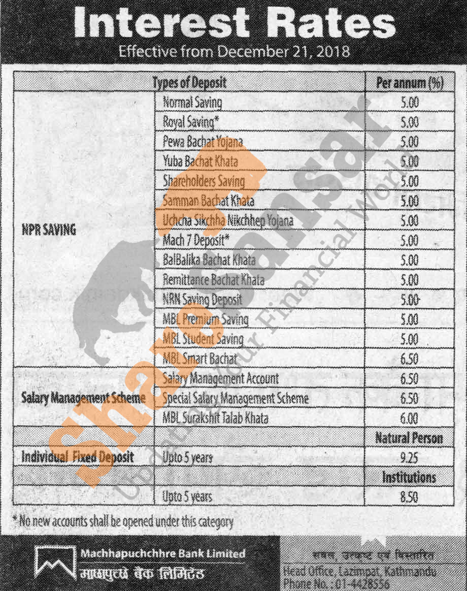 Machhapuchchhre Bank Limited has published a notice regarding new interest rate and its effective from 6th Poush, 2075.