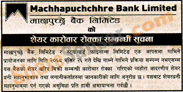 Machhapuchchhre Bank Limited has published a notice regarding stoppage of trading on NEPSE due to ongoing merger process with Standard Finance.