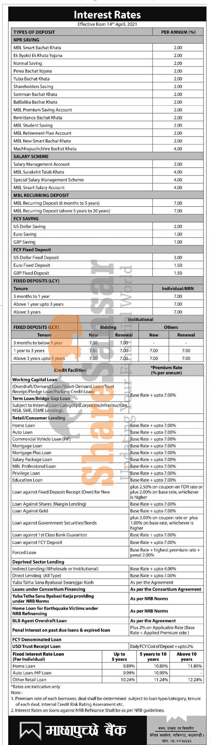 Machhapuchchhre Bank Limited has published a notice regarding the new interest rate for deposit and loan products and it's effective from 1st Baisakh, 2078.