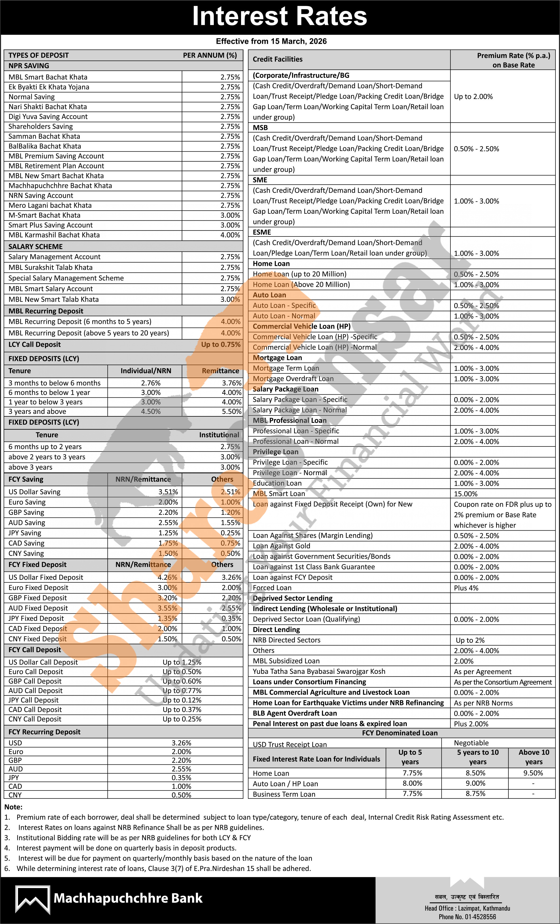 Machhapuchchhre Bank Limited has published a notice regarding the new interest rate for deposit and loan products and it's effective from 1st Chaitra, 2082.