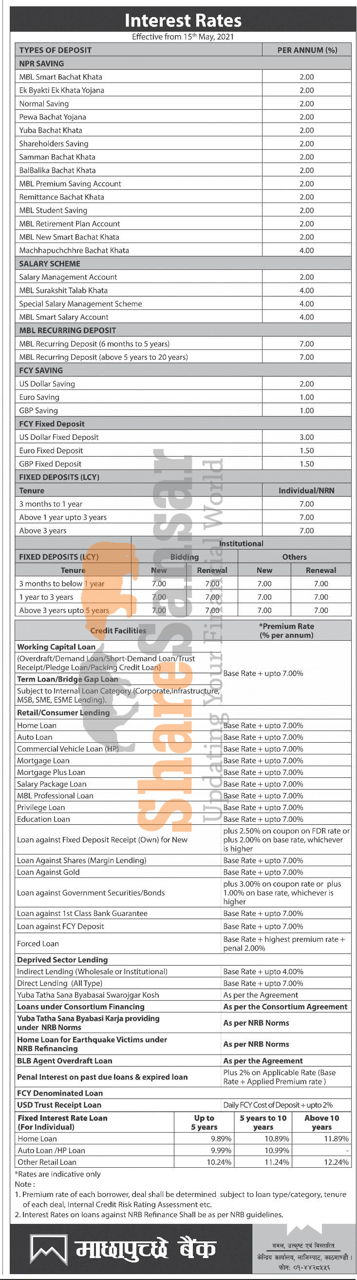 Machhapuchchhre Bank Limited has published a notice regarding the new interest rate for deposit and loan products and it's effective from 1st Jestha, 2078.