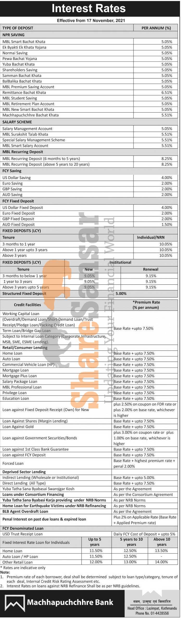 Machhapuchchhre Bank Limited has published a notice regarding the new interest rate for deposit and loan products and it's effective from 1st Mangsir, 2078.
