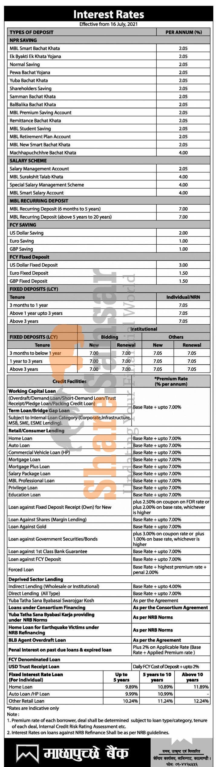 Machhapuchchhre Bank Limited has published a notice regarding the new interest rate for deposit and loan products and it's effective from 1st Shrawan, 2078.