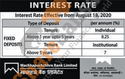 Machhapuchchhre Bank Limited has published a notice regarding the new interest rate for its deposit products and its effective from 2nd Bhadra, 2077.