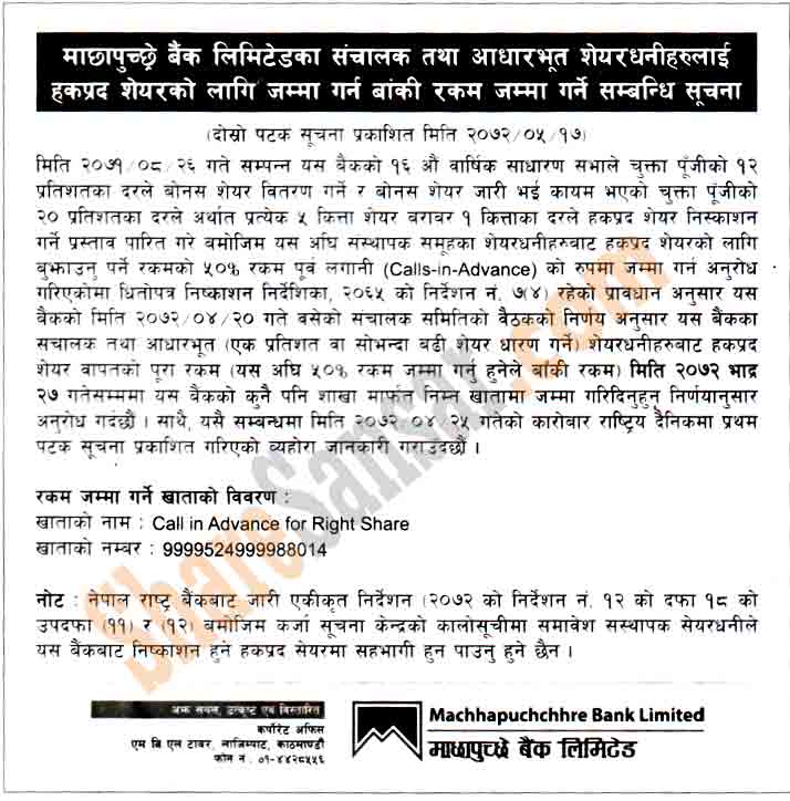 Machhapuchchhre Bank Limited urge its promoter shareholders to make payment of call in advance for 5:1 right share till 27th Bhadra, 2072.
