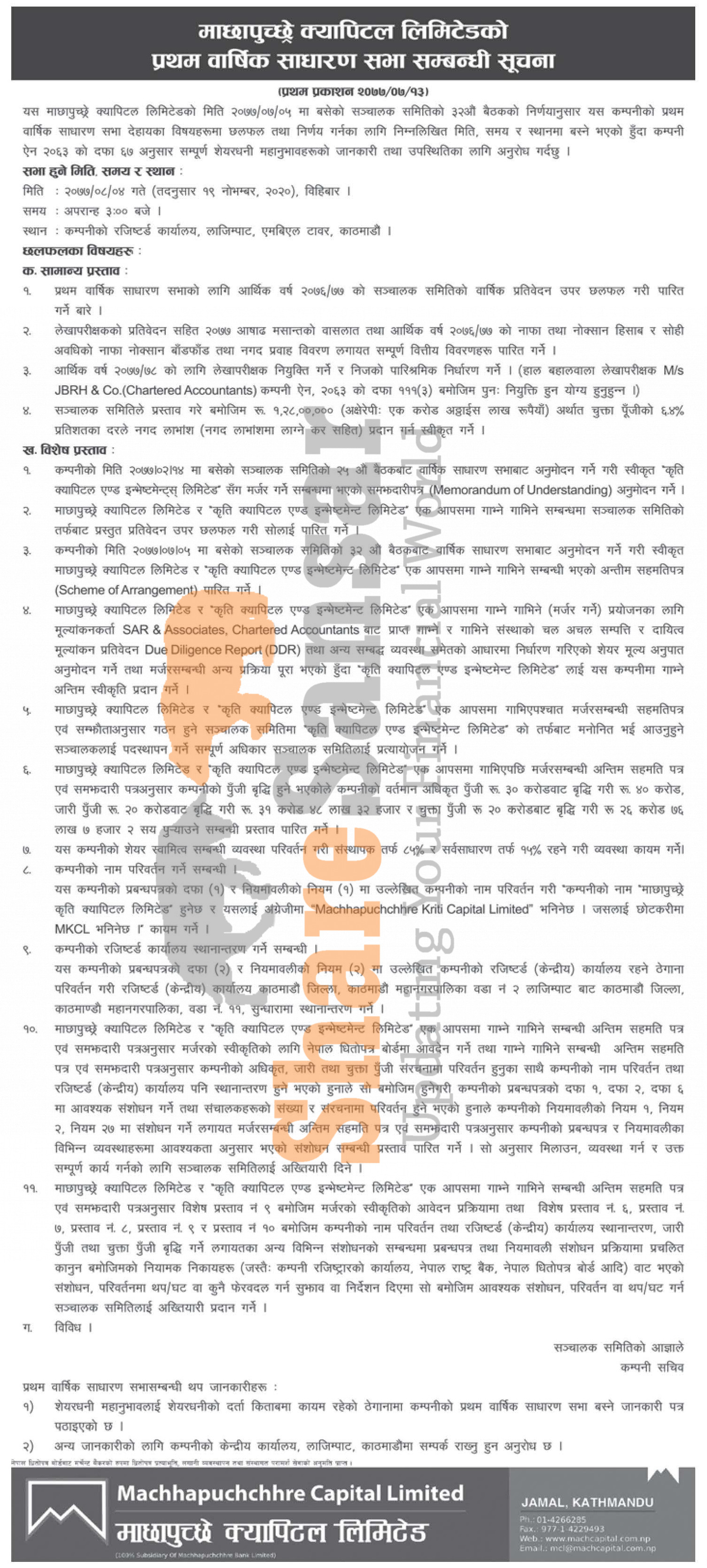 Machhapuchchhre Capital Limited has announced its 1st AGM going to be held on 4th Mangsir, 2077.