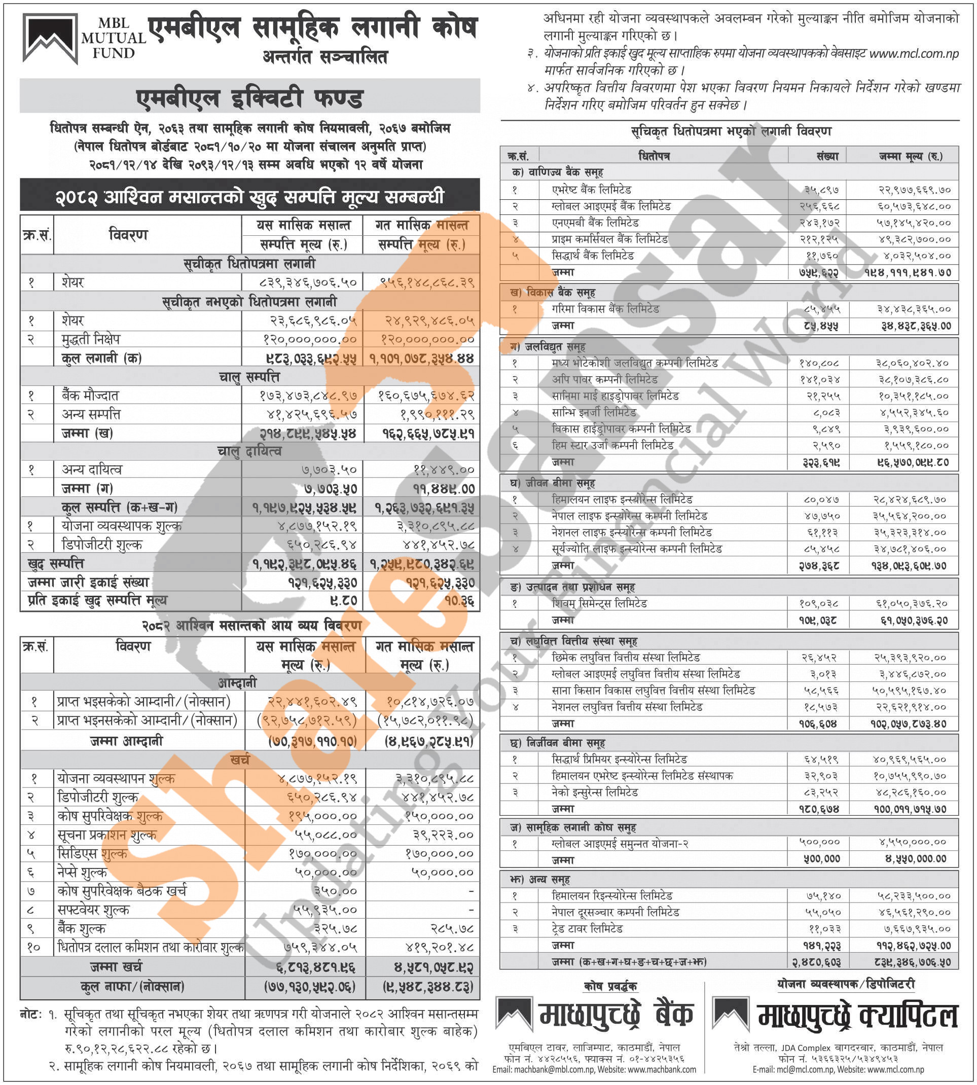 Machhapuchchhre Capital Limited has published “MBL Equity Fund” Net Asset Value (NAV) till Ashwin, 2082.