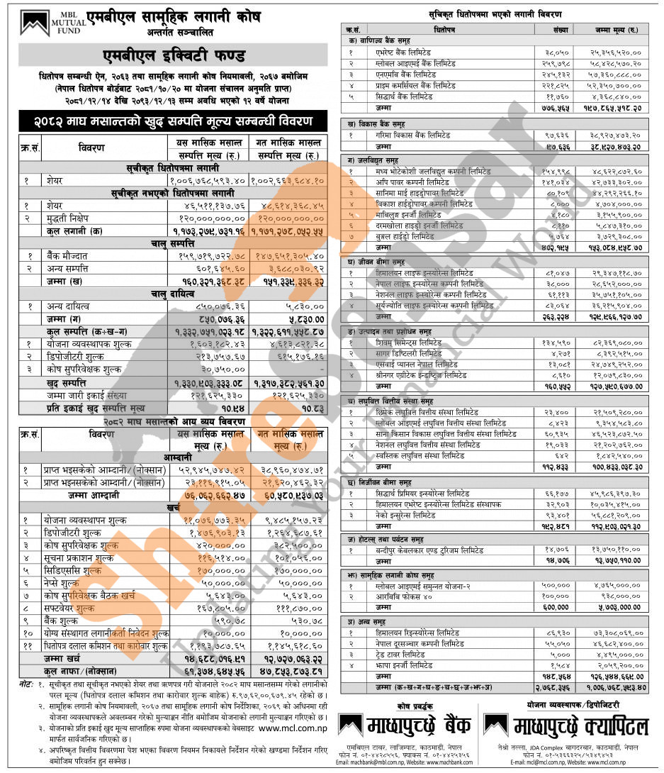 Machhapuchchhre Capital Limited has published “MBL Equity Fund” Net Asset Value (NAV) till Magh, 2082.