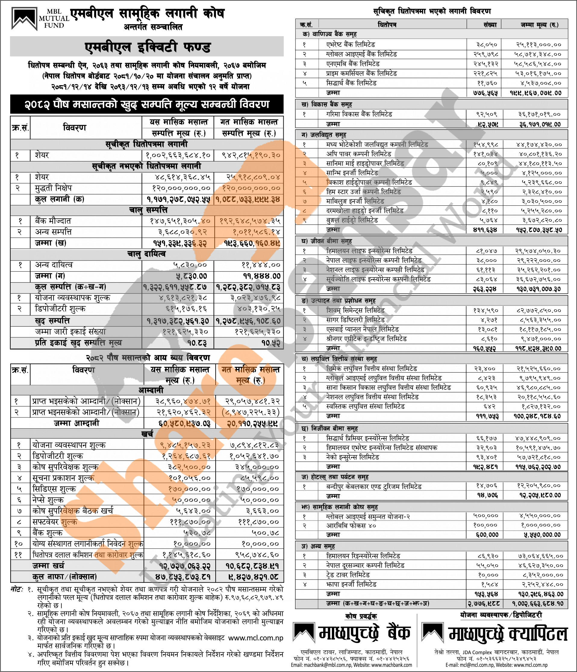 Machhapuchchhre Capital Limited has published “MBL Equity Fund” Net Asset Value (NAV) till Poush, 2082.