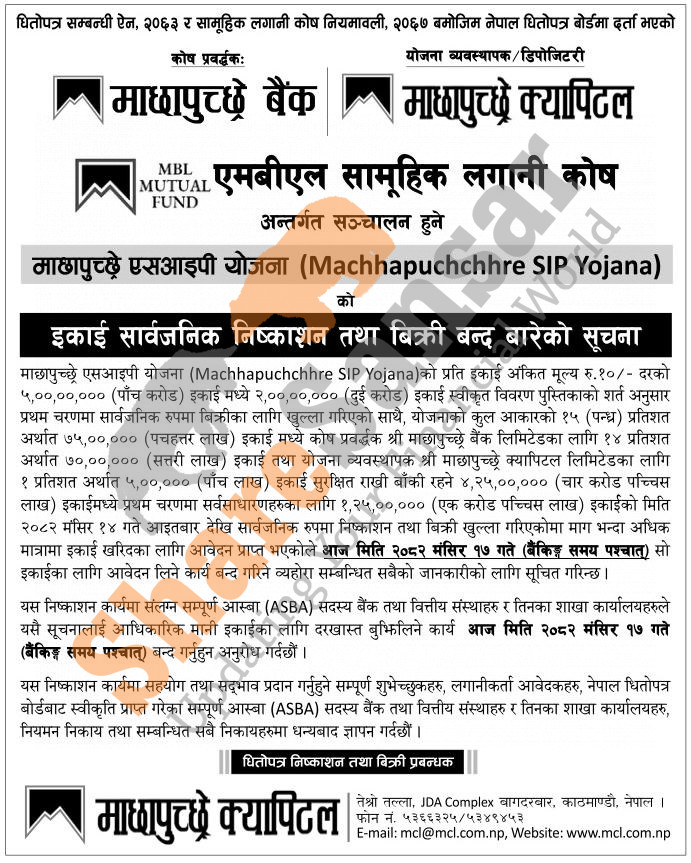 Machhapuchchhre Capital Limited is closing its 50 million units of Rs 10 face value each mutual fund scheme "Machhapuchchhre SIP Yojana" to the general public from today (17th Mangsir, 2082).