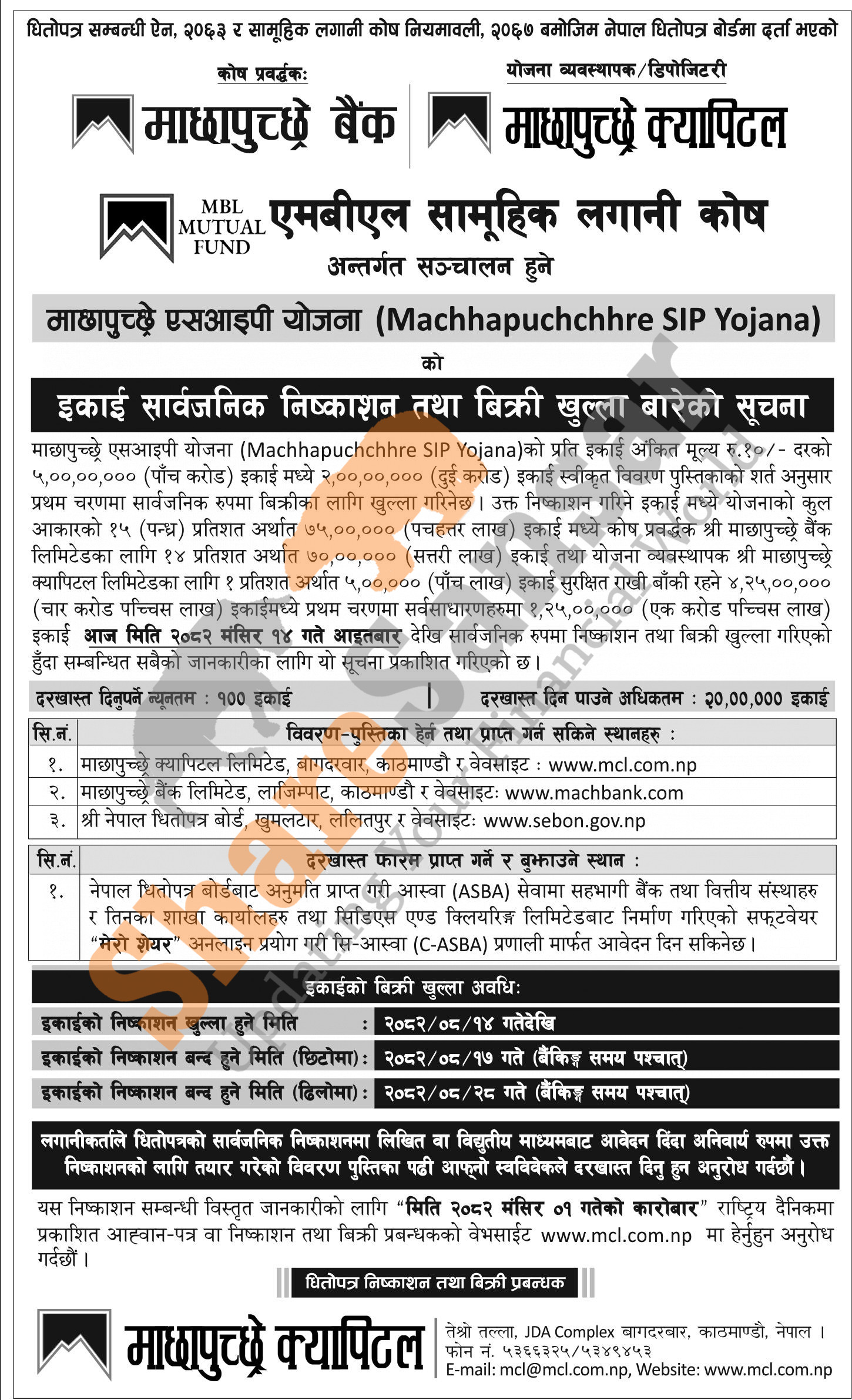 Machhapuchchhre Capital Limited is opening its 50 million units of Rs 10 face value each mutual fund scheme "Machhapuchchhre SIP Yojana" to the general public from today (14th Mangsir, 2082).