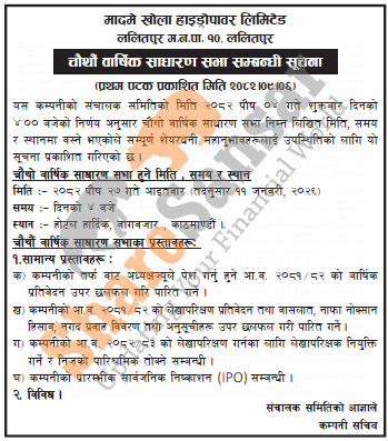 Madame Khola Hydropower Limited has announced its 4th AGM going to be held on 27th Poush, 2082.