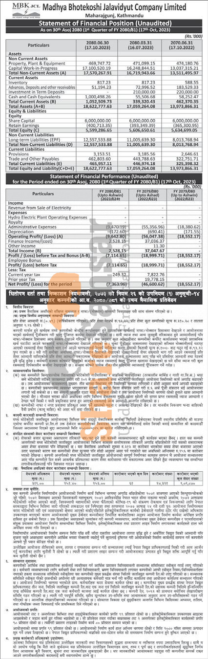 Madhya Bhotekoshi Jalavidyut Company Limited has posted a net loss of Rs 7.36 million and published its 1st quarter company analysis of the fiscal year 2080/81.