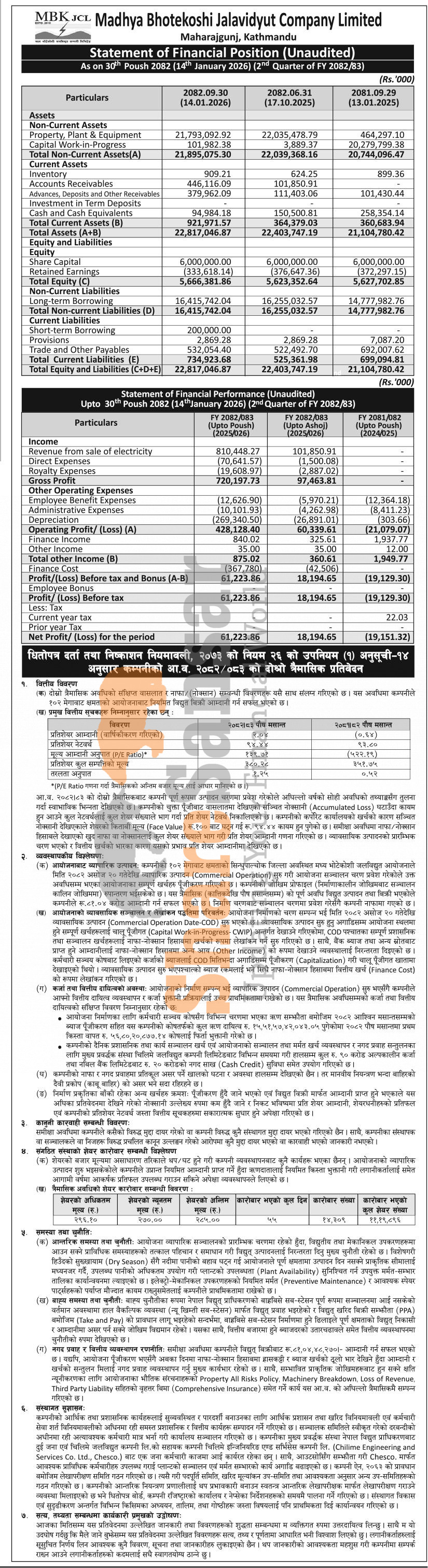 Madhya Bhotekoshi Jalavidyut Company Limited has posted a net profit of Rs 61.22 million and published its 2nd quarter company analysis of the fiscal year 2082/83.