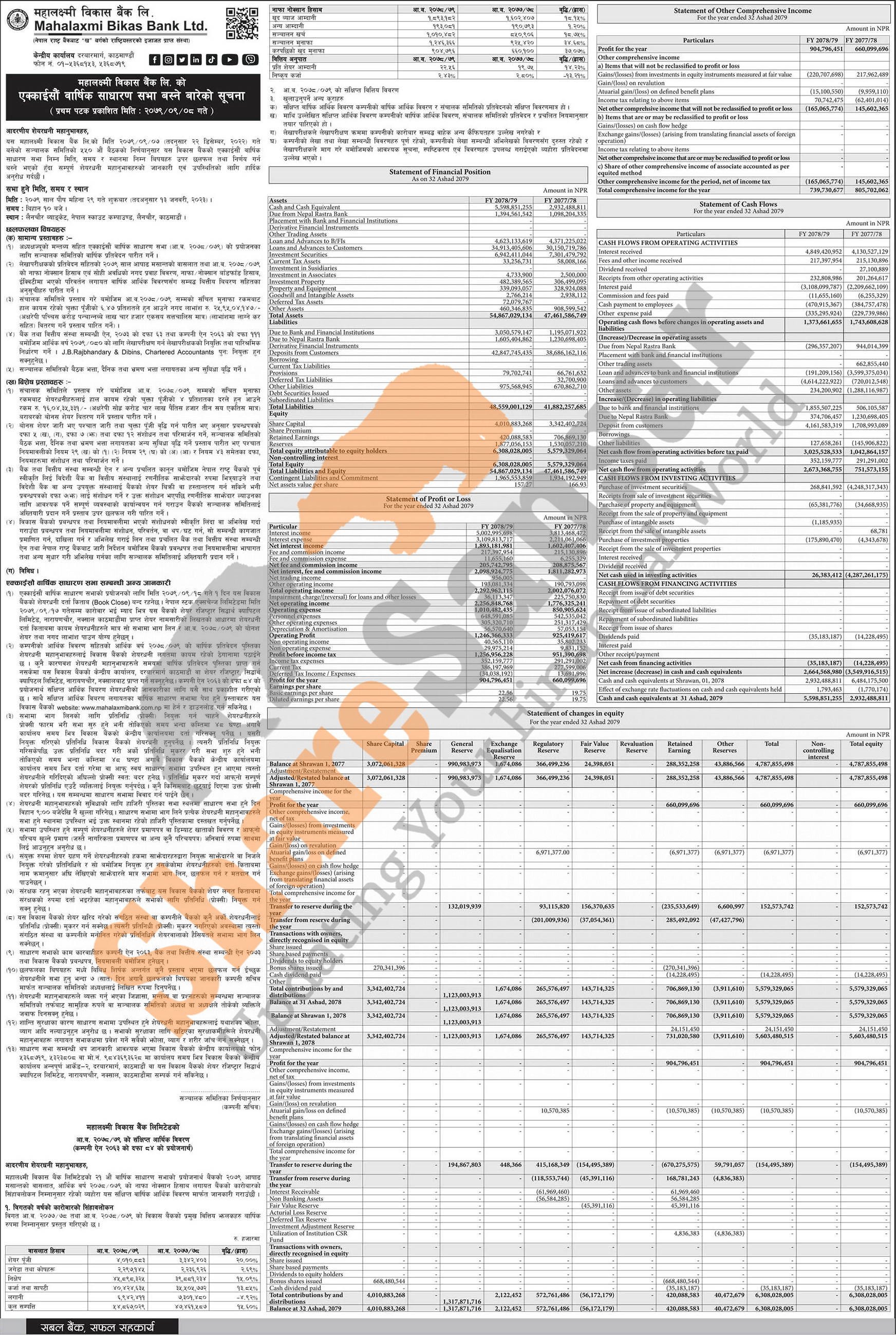 Mahalaxmi Bikas Bank Limited has announced its 21st AGM going to be held on 29th Poush, 2079 and has published its financial highlights of fiscal year 2078/79.