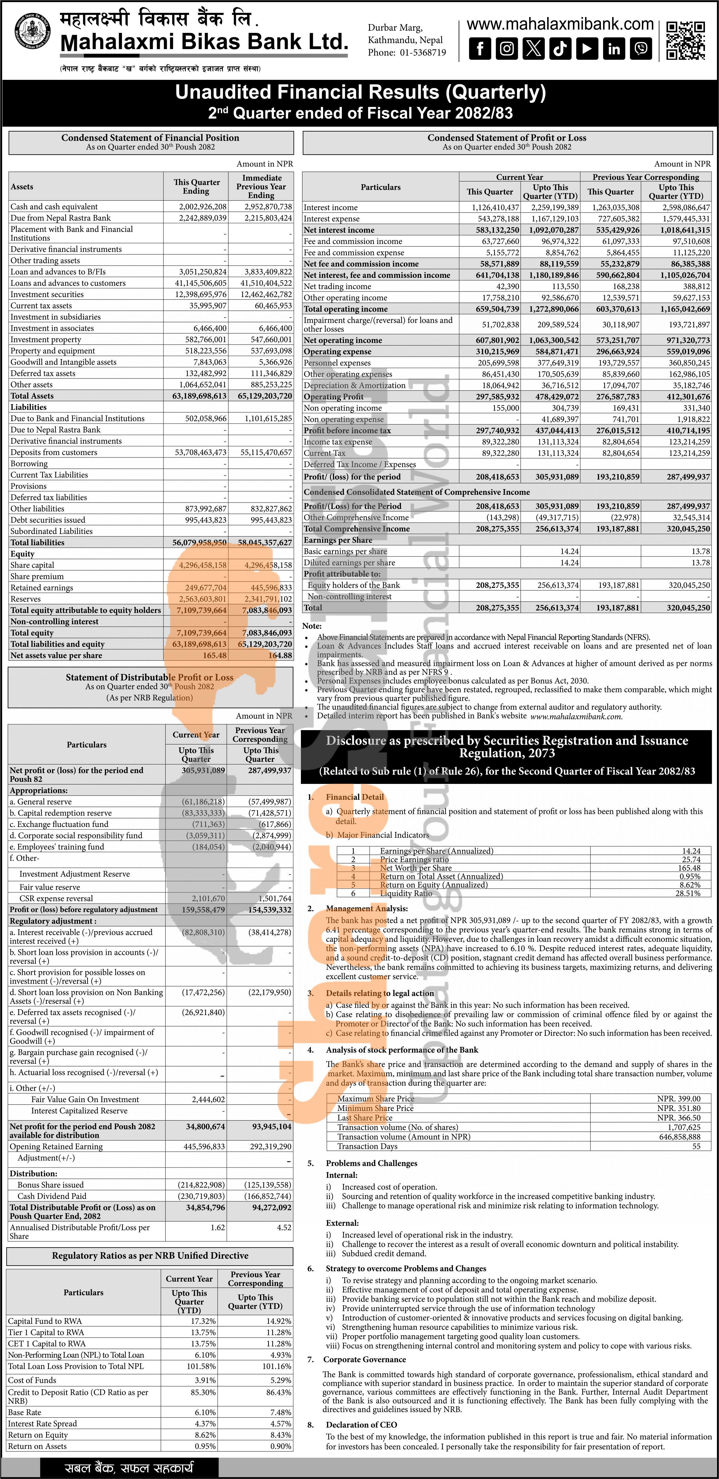 Mahalaxmi Bikas Bank Limited has posted a net profit of Rs 305.93 million and published its 2nd quarter company analysis of the fiscal year 2082/83.