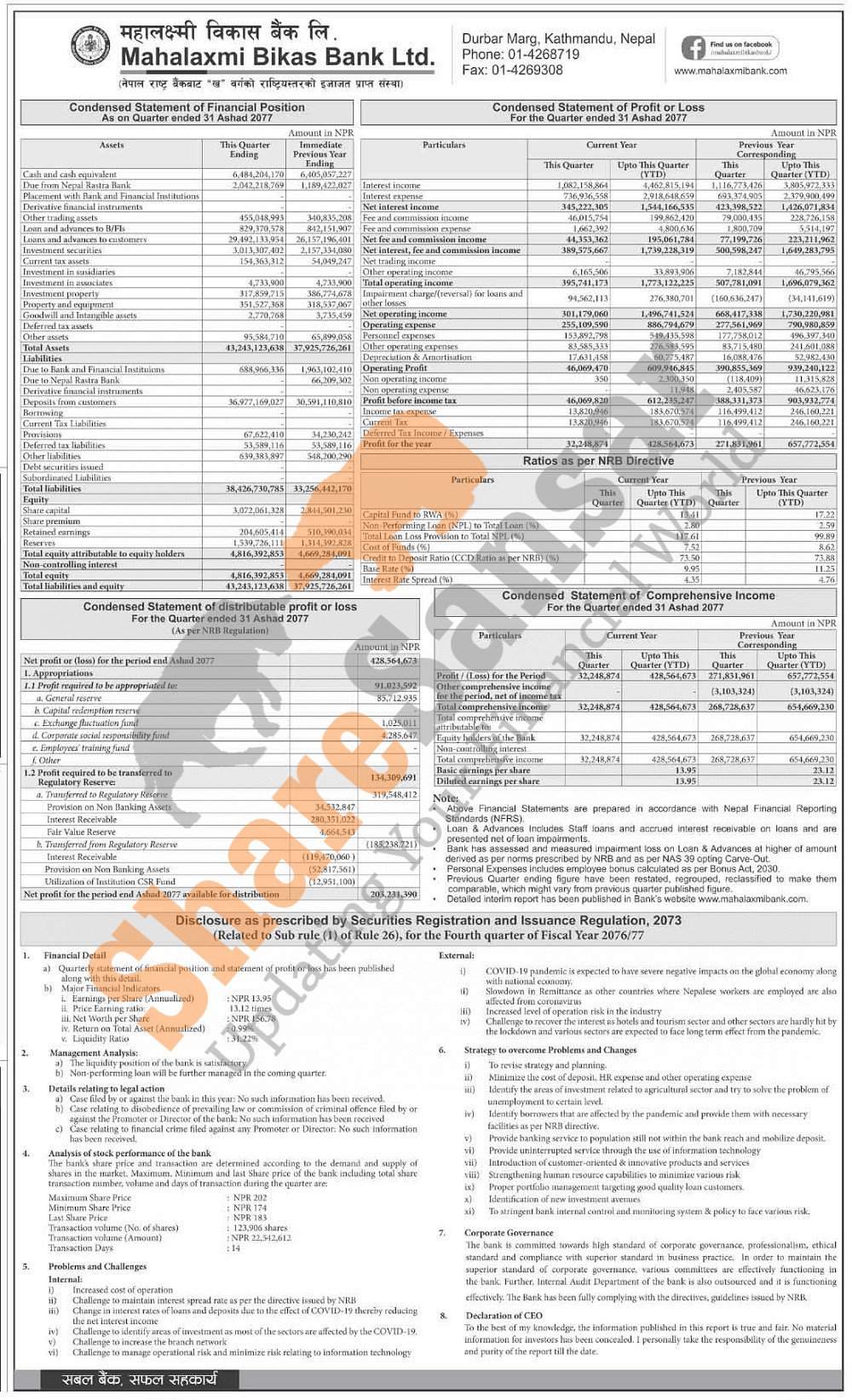Mahalaxmi Bikas Bank Limited has posted a net profit of Rs 428.56 million and published its 4th quarter company analysis of the fiscal year 2076/77.