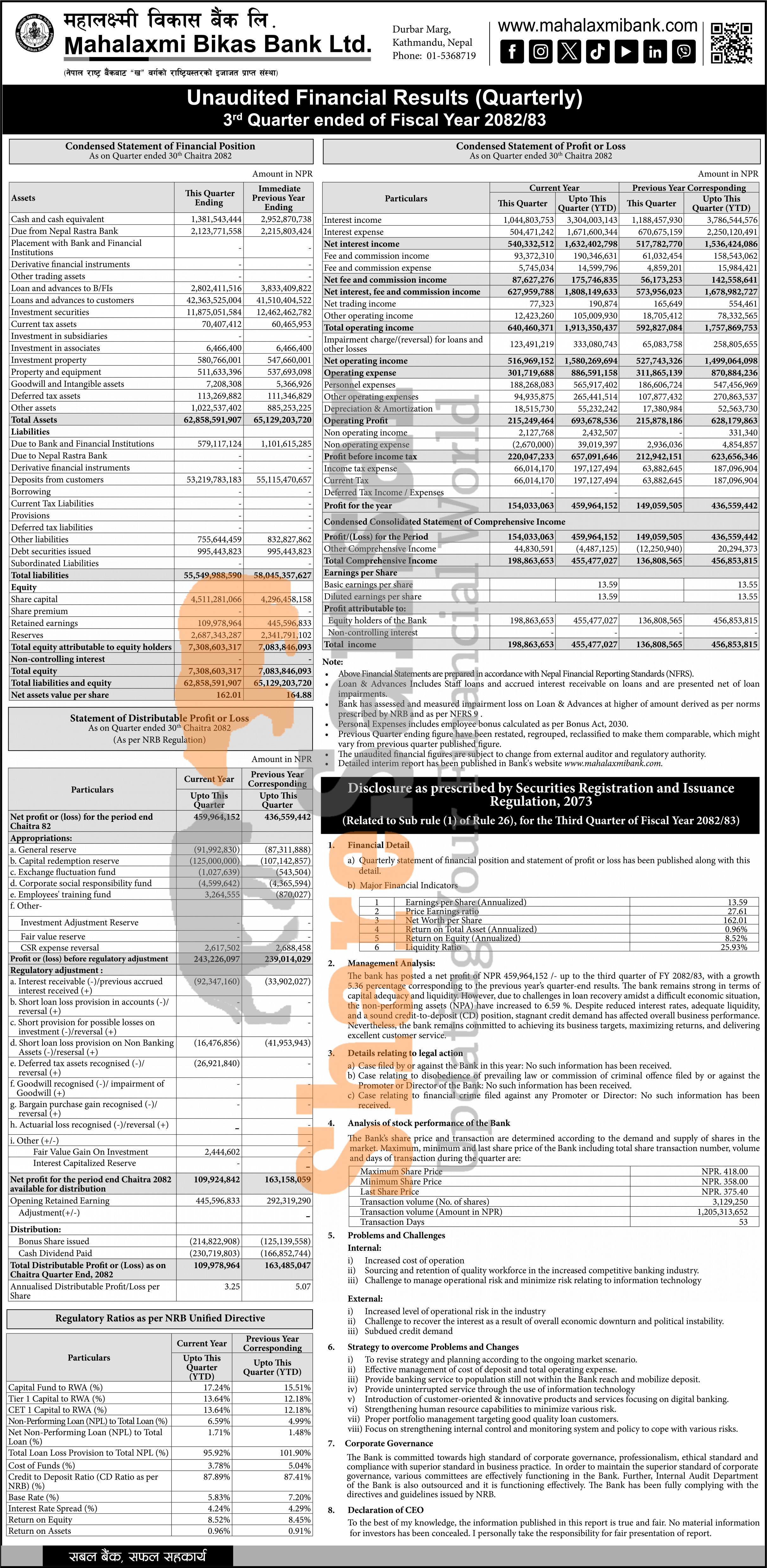 Mahalaxmi Bikas Bank Limited has posted a net profit of Rs 459.96 million and published its 3rd quarter company analysis of the fiscal year 2082/83.
