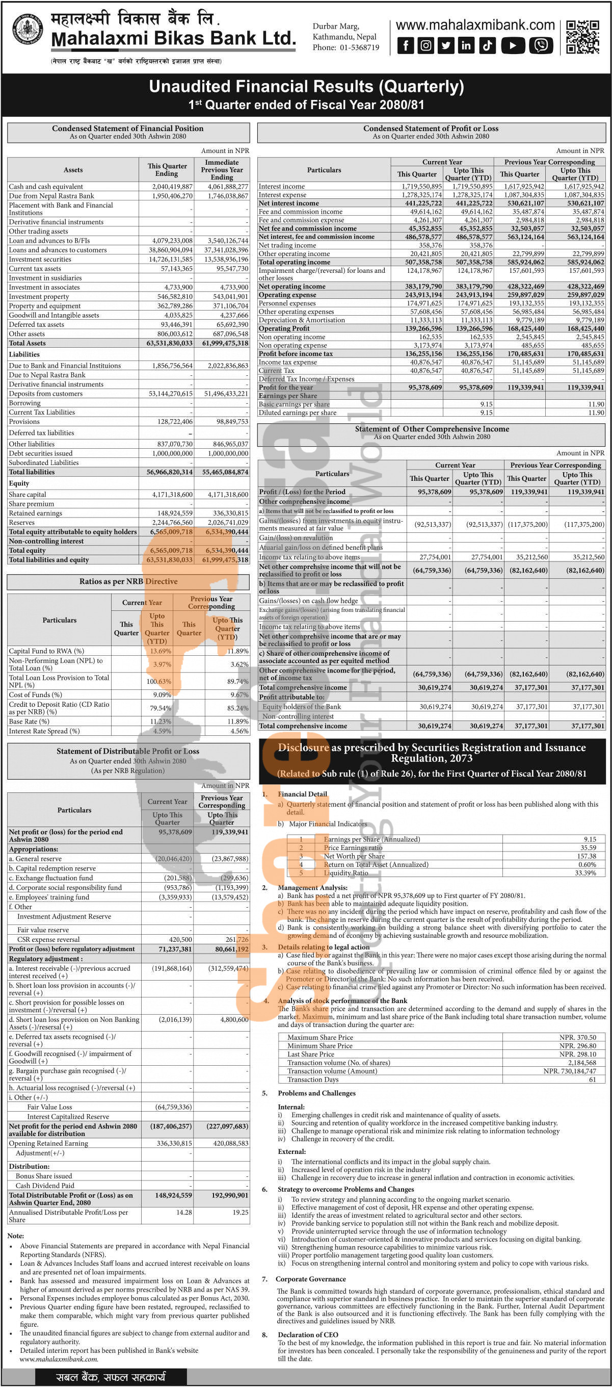Mahalaxmi Bikas Bank Limited has posted a net profit of Rs 95.37 million and published its 1st quarter company analysis of the fiscal year 2080/81.