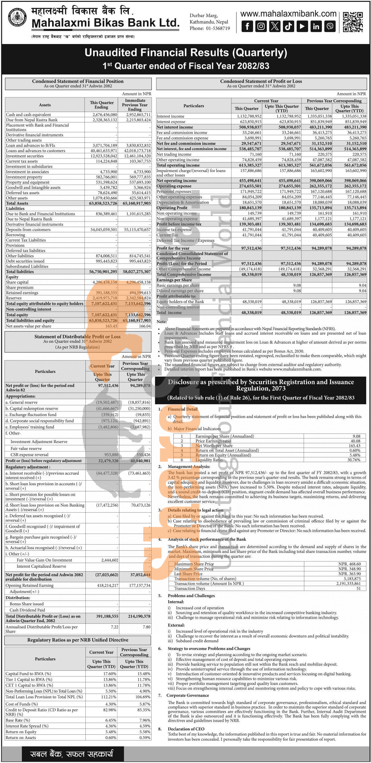 Mahalaxmi Bikas Bank Limited has posted a net profit of Rs 97.51 million and published its 1st quarter company analysis of the fiscal year 2082/83.