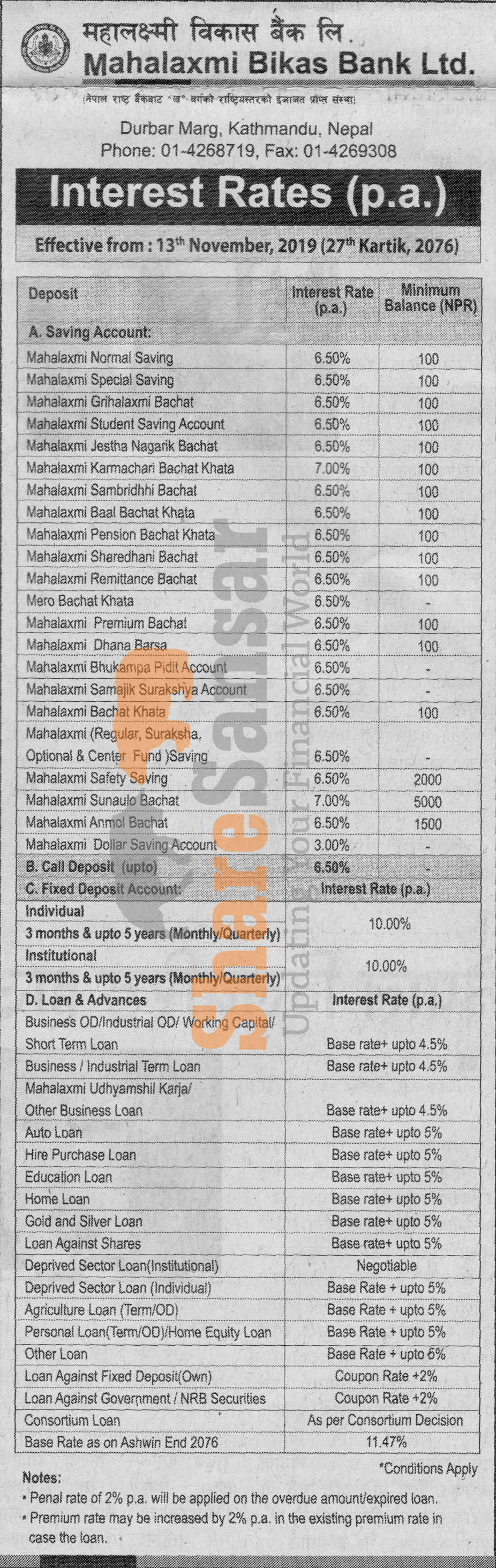 Mahalaxmi Bikas Bank Limited has published a notice regarding new interest rate and its effective from 27th Kartik, 2076.