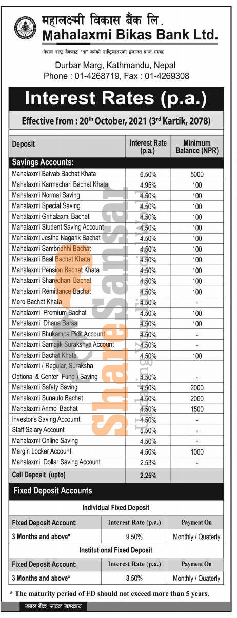 Mahalaxmi Bikas Bank Limited has published a notice regarding new revised interest rate and it's effective from 3rd Kartik, 2078.